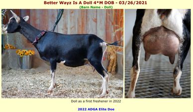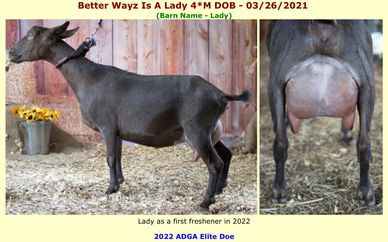 SDam: SG Better Wayz Isabelle 1*M VEEE91 2020, 2021 & 2022 ADGA Elite Doe. 2020 & 2021 Top Ten for Butterfat - 1st place 2021! Superior Genetics Designation